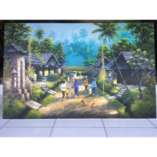 Lukisan kanvas pemandangan kampung 90x130 cm rd. Hiasan dinding lukisan cetak suasana kampung halaman plus bingkai. Sby menuangkan kisah mengenai kampung halamannya melalui karya lukisan panorama alam di pacitan. Daftar harga lukisan suasana desa terbaru juni 2022.
